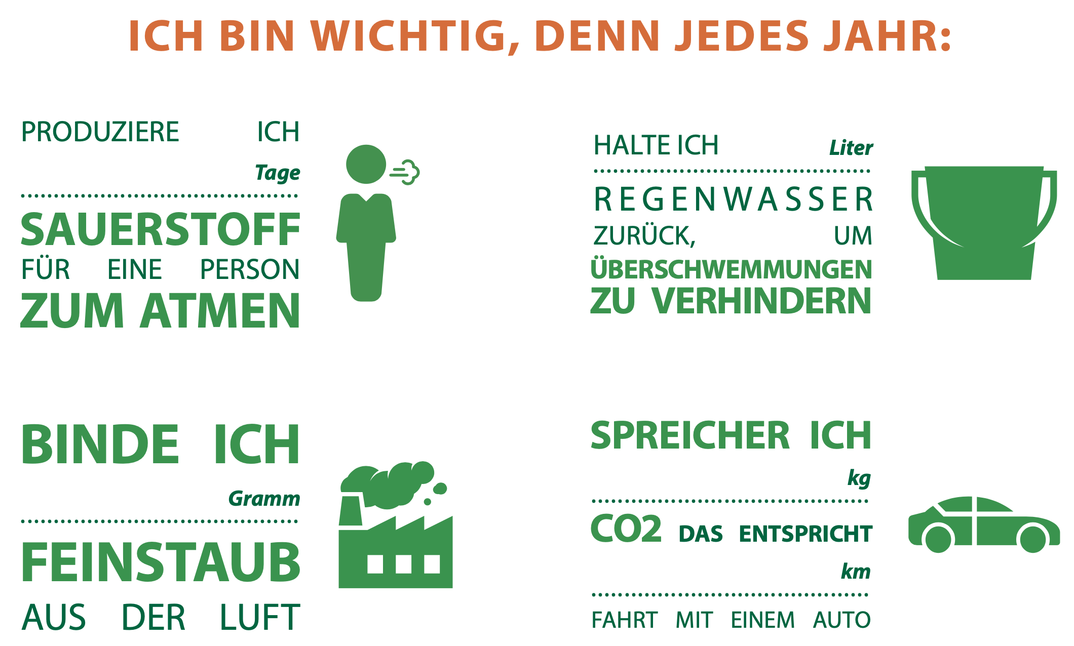 Ein einziger ausgewachsener Baum kann an einem heißen Tag bis zu 400 Liter Wasser aus dem Boden ziehen, welches er dann wieder verdunstet. Durch die Verdunstungskühle wird die Temperatur im Umfeld des Baumbestandes um bis zu 10 Grad gesenkt. Dies ist entscheidend für das Wohlbefinden und die Gesundheit von uns Menschen und für einen geringeren Energiebedarf, denn Klimaanlagen werden so unnötig.